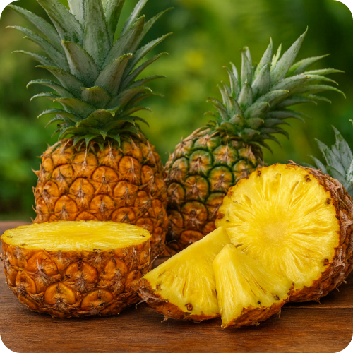 Nosso picolé de abacaxi é feito com a fruta in natura, cortada na hora em nossa cozinha.